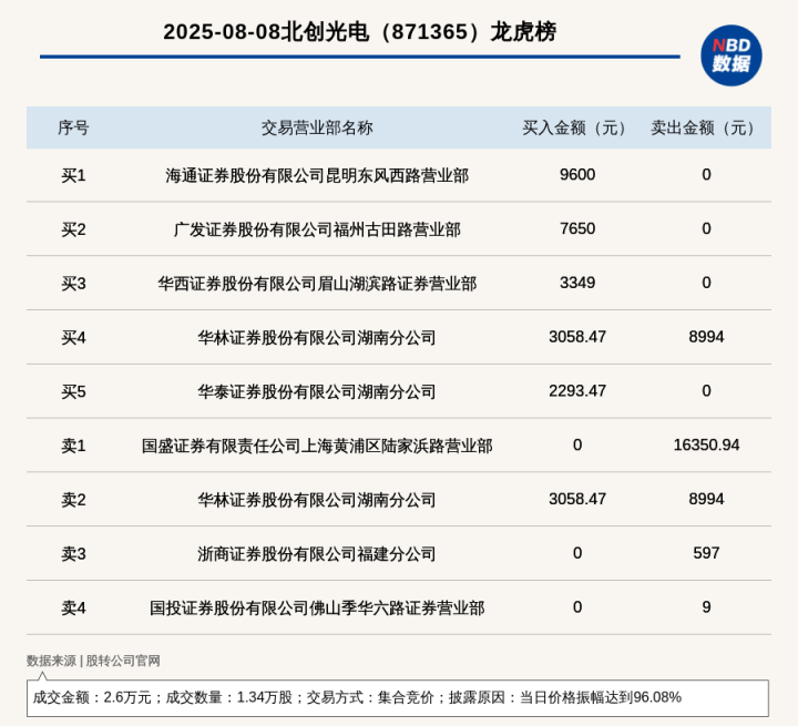 每经讯,2025年8月8日,新三板创新层公司北创光电(871365,收盘价:1.53元)登上龙虎榜,交易方式是集合竞价,披露原因是当日价格振幅达到96.08%,成交数量1.34万股,成交金额2.6万元。买一席位为海通证券股份有限公司昆明东风西路营业部,买入9600元;卖一席位为国盛证券有限责任公司上海黄浦区陆家浜路营业部,卖出1.64万元。