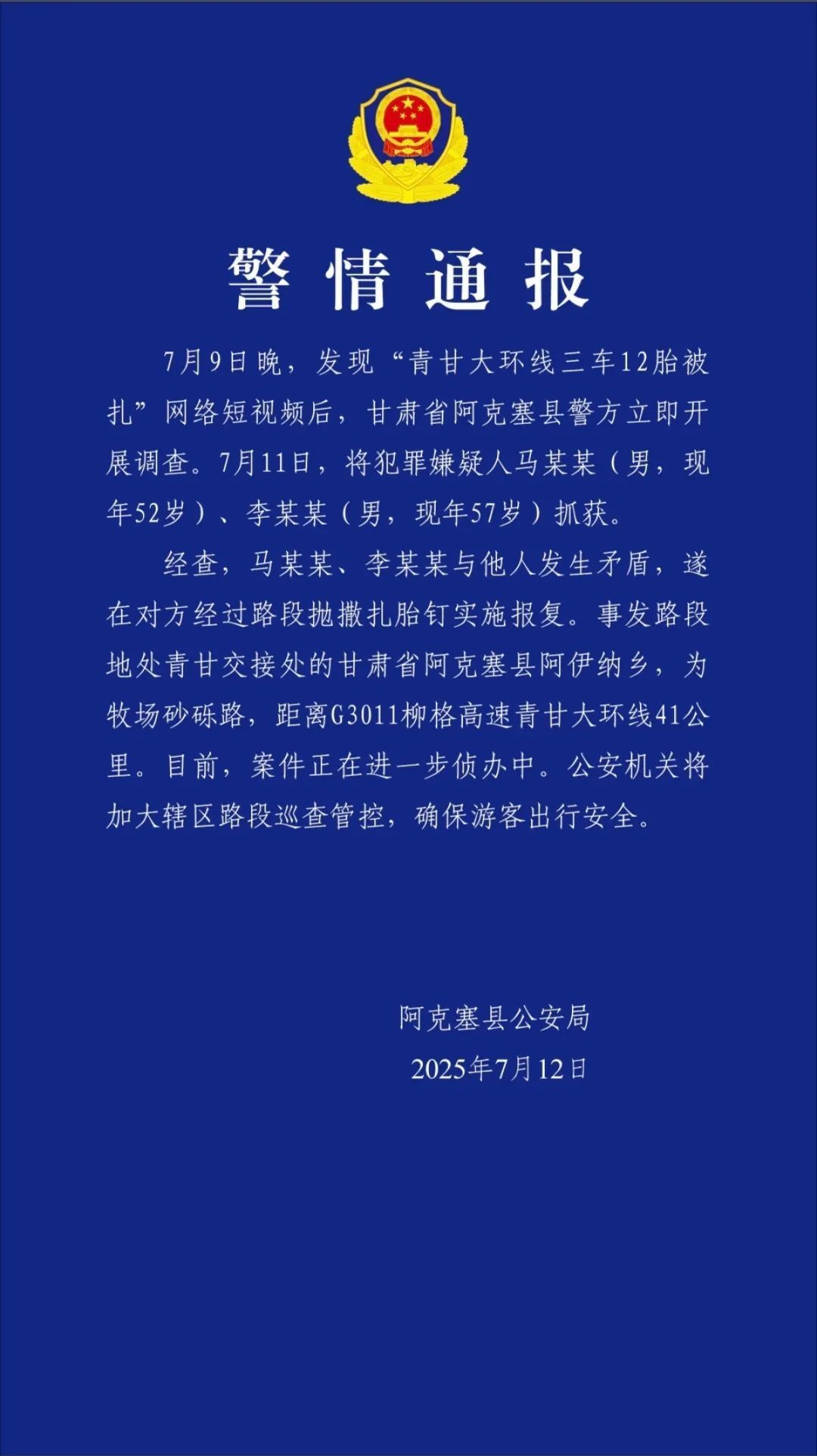 7月12日,甘肃省阿克塞县警方通报“青甘大环线三车12胎被扎”事件:两名犯罪嫌疑人被抓获,详情如下: